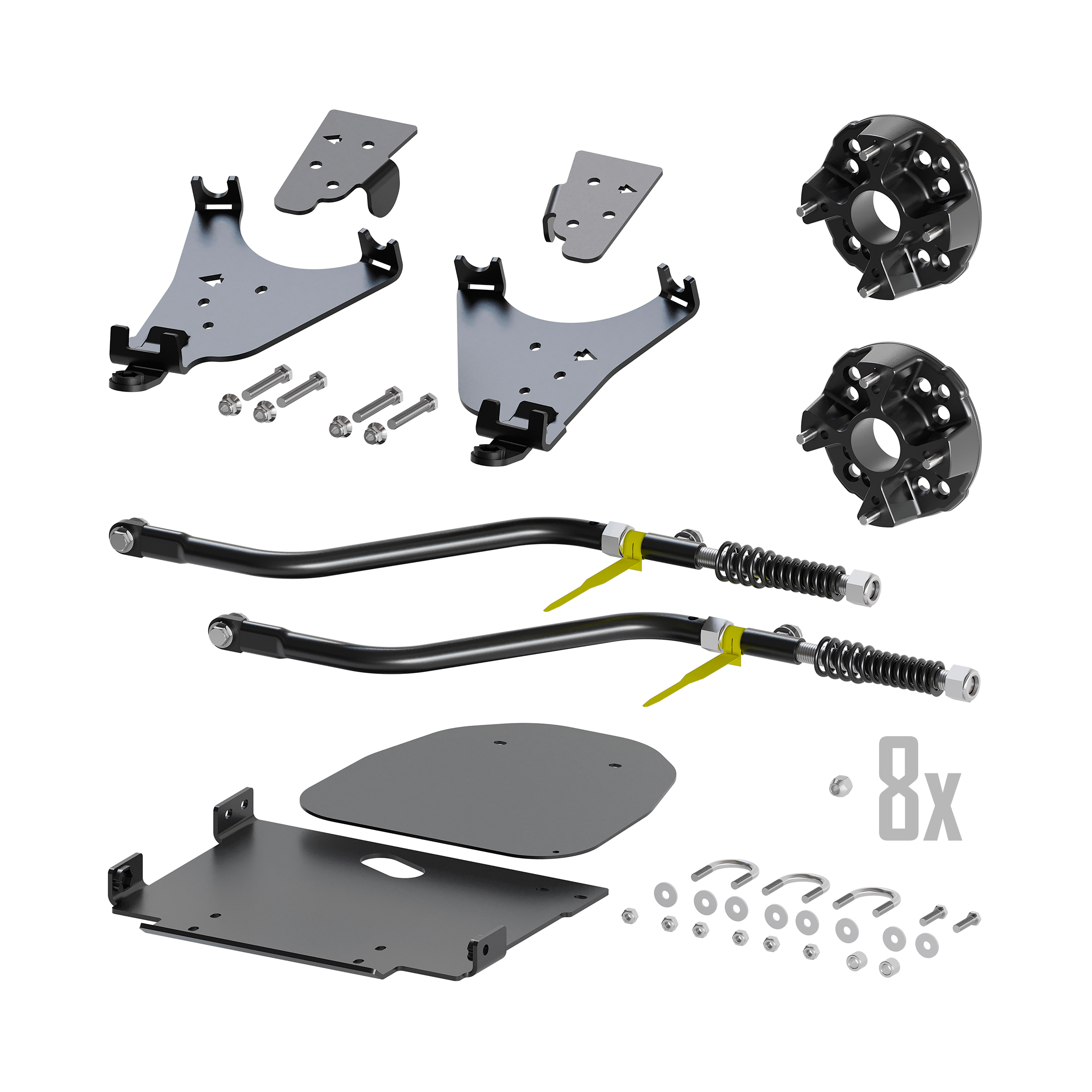 Includes front brackets, rear plate, 2 spacers, rear arms, and 8 lug nuts.