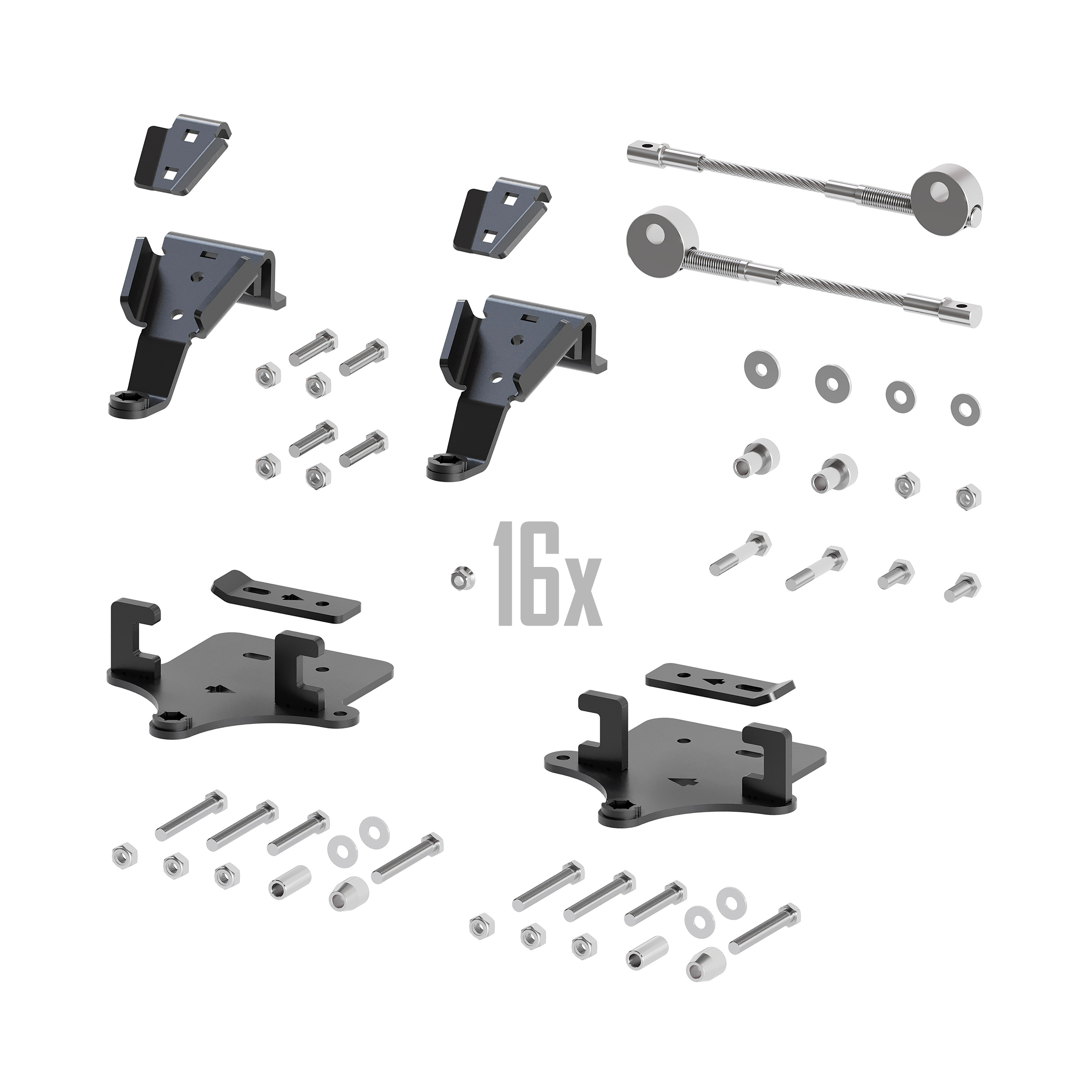 Includes front brackets, rear brackets, limiter cables and 16 lug nuts.
