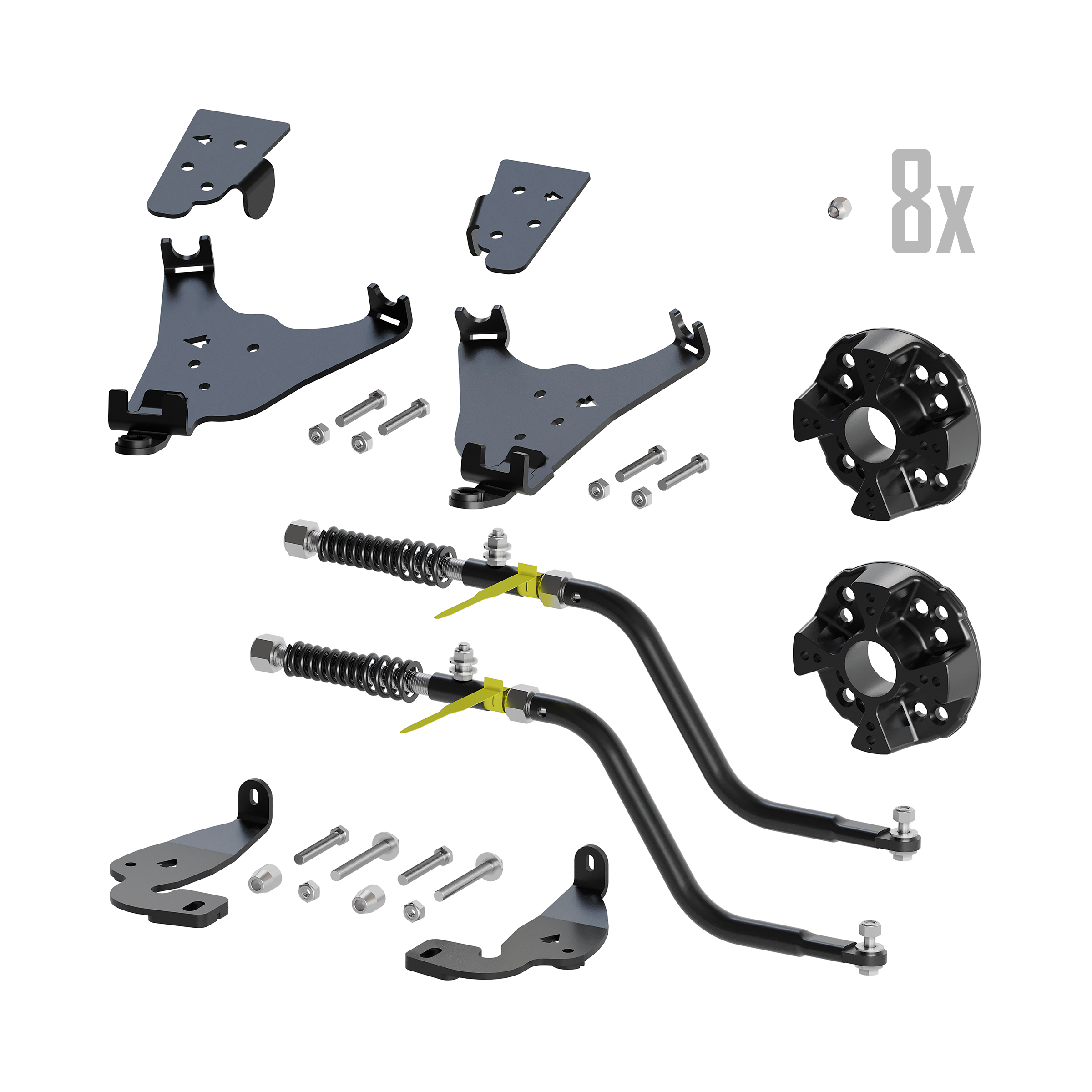 Includes front brackets, rear brackets, 2 spacers, rear arms, and 8 lug nuts.