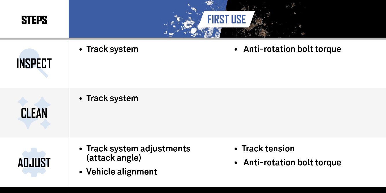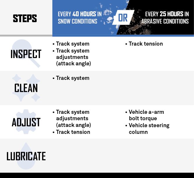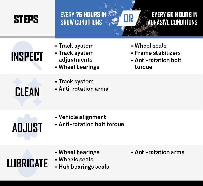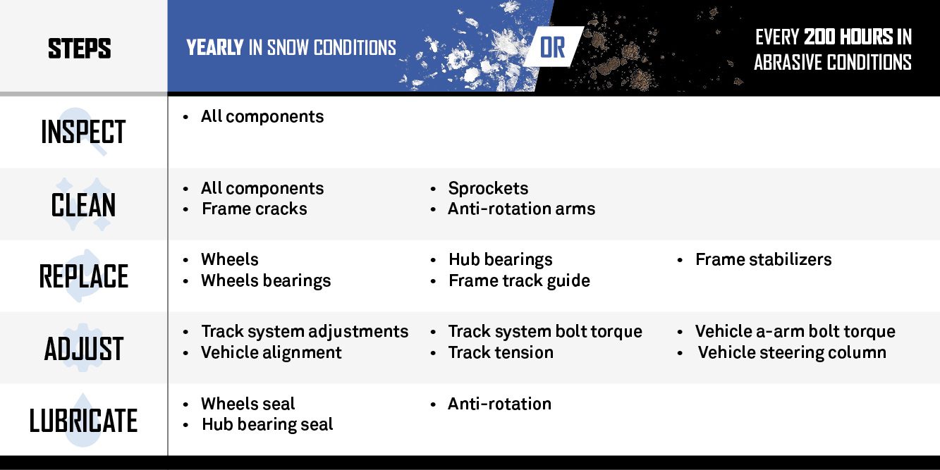 You can find complete maintenance instructions for your specific Camso track system in your Owner's Manual, but below is a handy checklist that you can use as a reminder. It explains what to inspect, clean, adjust, and lubricate at key intervals based on usage conditions.