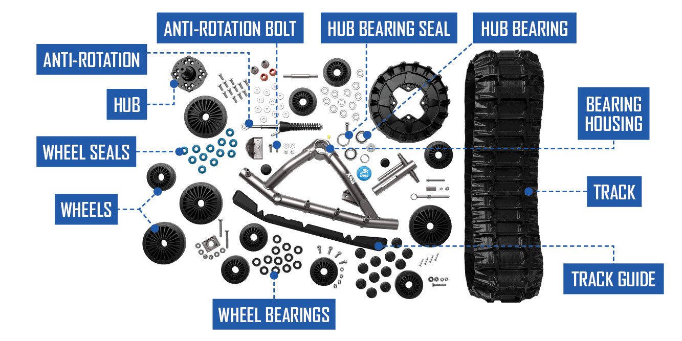 All other Camso track systems (Camso UTV 4S1 and Camso X4S) have double-bearing bolted-on wheels for easier serviceability and maintenance (read: the bearings can be replaced).