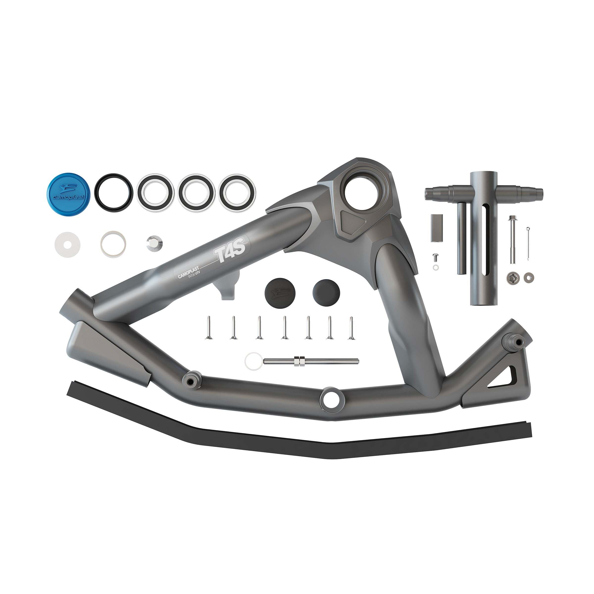 Includes all components needed to securely assemble the front left side track: frame, tensioner, 3 bearings, seal, spacer, hub cap, hub bolt with a washer and 7 guide screws.