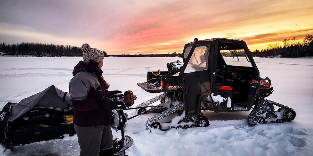 Au matin, elle se lève avant l’aurore et charge son traîneau qu’elle accroche derrière son Polaris Ranger, équipé du système de chenilles Camso UTV 4S1, et se dirige vers le lac.