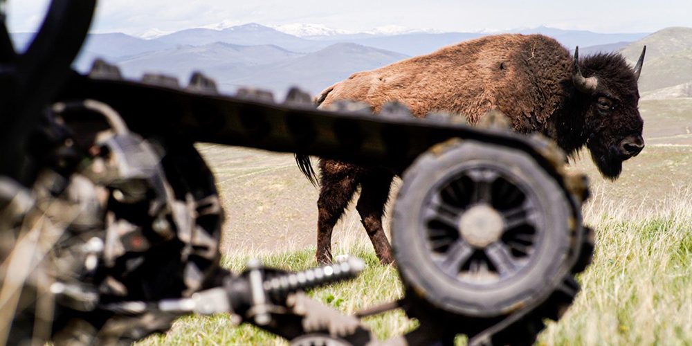 Les bisons sont bien trop rapides et dangereux pour que l’équipe puisse les approcher à pied, alors nous utilisons toujours nos véhicules équipés de systèmes de chenilles lorsque nous devons déplacer un troupeau de quelques centaines de bisons d’un pâturage à un autre. Ou bien s’ils sortent et que nous devons les ramener dans leur pâturage, il est difficile d’aller les chercher. Nous avons été dans cette situation délicate à quelques reprises.