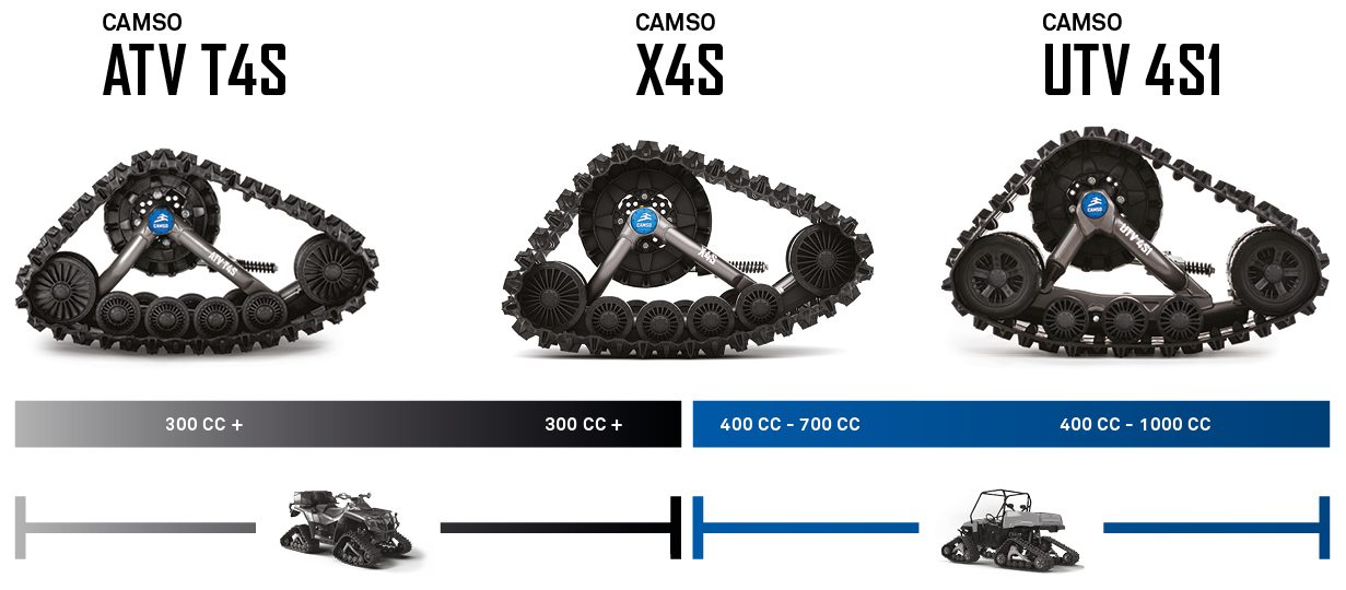 Si les systèmes de chenilles Camso sont interchangeables, tous les modèles ne conviennent pas à tous les véhicules. Au contraire, nos différents modèles ont été conçus pour des cylindrées et des véhicules spécifiques. Certains de nos systèmes de chenilles sont uniquement destinés aux VTT, tandis que d’autres sont pour les véhicules côte à côte seulement. Nous offrons aussi un modèle qui convient aux deux. Voici les différents modèles: