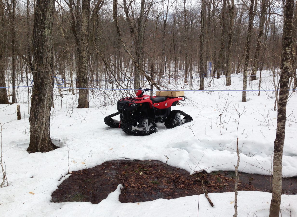 Le terrain est assez varié, certains endroits sont plus accessibles tandis que d’autres parties le terrain est accidenté et il y a des côtes abruptes. Il y a un chemin forestier accessible par VTT ou tracteur qui se rend jusqu’au bout de la terre. Nous utilisons le VTT avec les systèmes de chenilles à 100% dans la neige pour circuler un peu partout dans la forêt. C’est un choix que nous faisons et c’est d’ailleurs ce qui a motivé l’achat des chenilles, pour pouvoir accéder à l’ensemble de notre terre en hiver, quelles que soient les conditions. On peut aller plus loin qu’on ne pourrait avec un autre véhicule et avons une accessibilité rapide dans tous les coins de l’érablière, c’est vraiment extraordinaire! Il y a cinq activités principales où nous nous servons du véhicule avec les chenilles: